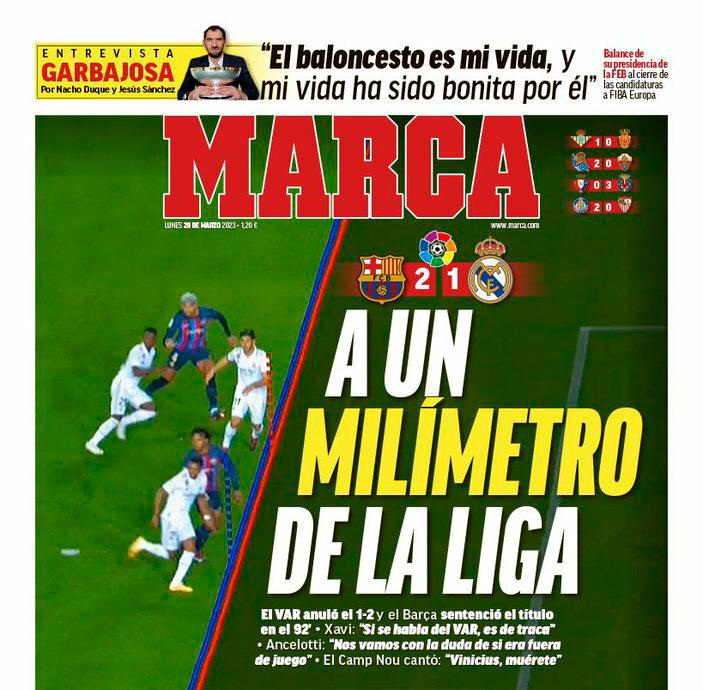 وقالت صحيفة ماركا، في غلافها اليوم، إن برشلونة أصبح على بعد واحد مليمتر من الليجا، حيث سردت إلغاء حكم الفيديو المساعد هدف الفوز لمدريد بنتيجة 1-2، ليفوز برشلونة والذي بات قريبًا من اللقب في الدقيقة 92.