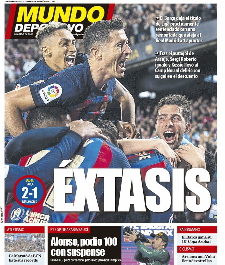 وعنونت موندو ديبورتيفو في غلافها اليوم بـ إثارة، حيث قالت إن برشلونة أشعل الكلاسيكو وترتيب الليجا، بعد أن سجل هدفًا قاتلًا في الدقيقة 91، حسم من خلاله المباراة.