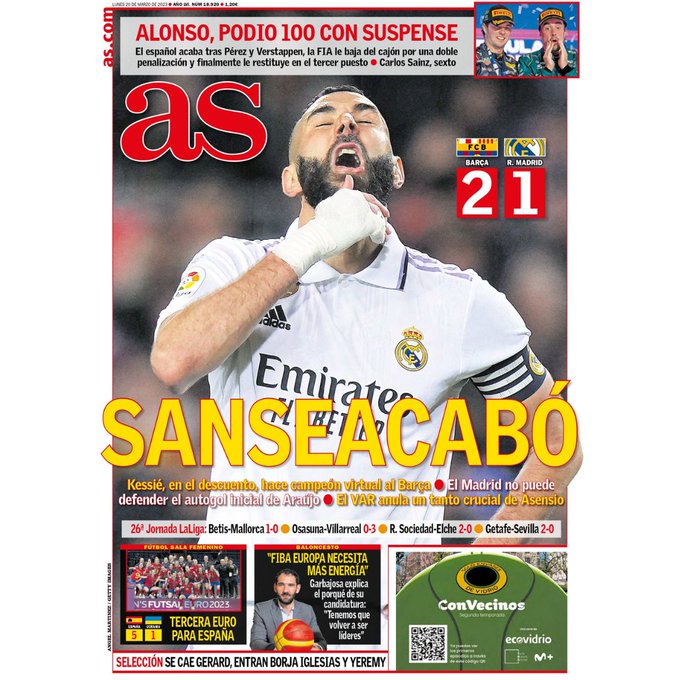 عنونت آس في غلافها اليوم، انتهت الفرص، حيث قالت إن كيسي جعل برشلونة البطل الافتراضي، كما أن مدريد لا يستطيع الدفاع عن هدف أراوخو الأول في مرماه، حكم الفيديو المساعد يلغي هدفًا حاسمًا من أسينسيو.