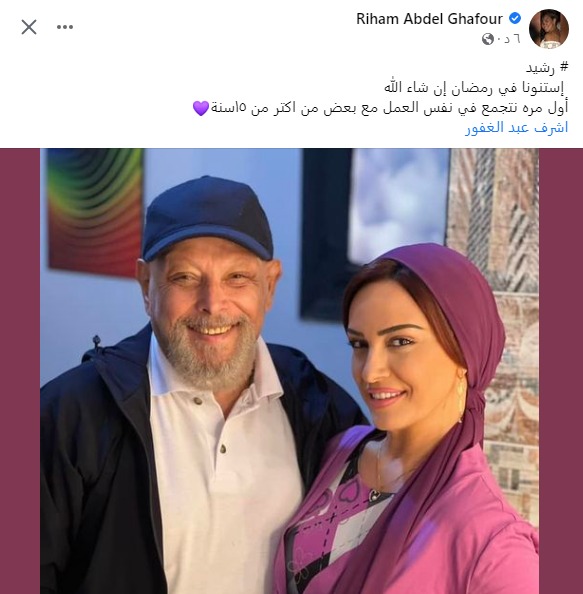 وعلقت ريهام عبد الغفور على الصورة، عبر حسابها الشخصي بموقع التواصل الاجتماعي فيس بوك، إذ قالت: رشيد.. استنونا في رمضان إن شاء الله، أول مره نتجمع في نفس العمل مع بعض.. من أكتر من 15 سنة.