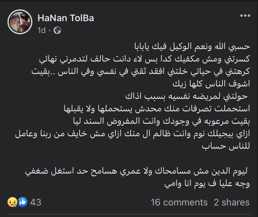 استغاثت فتاة تدعى حنان إبراهيم طلبة حميدة، تبلغ من العمر 23 عامًا، من مركز طلخا بمحافظة الدقهلية، عبر موقع التواصل الاجتماعي فيسبوك، حيث قالت في منشور لها: أنا بتعرض للعنف الأسري ومهددة بالقتل والرمي في الشارع أنا وأمي المريضة العاجزة، وعيلتي اللي المفروض انهم سندي وضهري اتخلوا عني تمامًا.