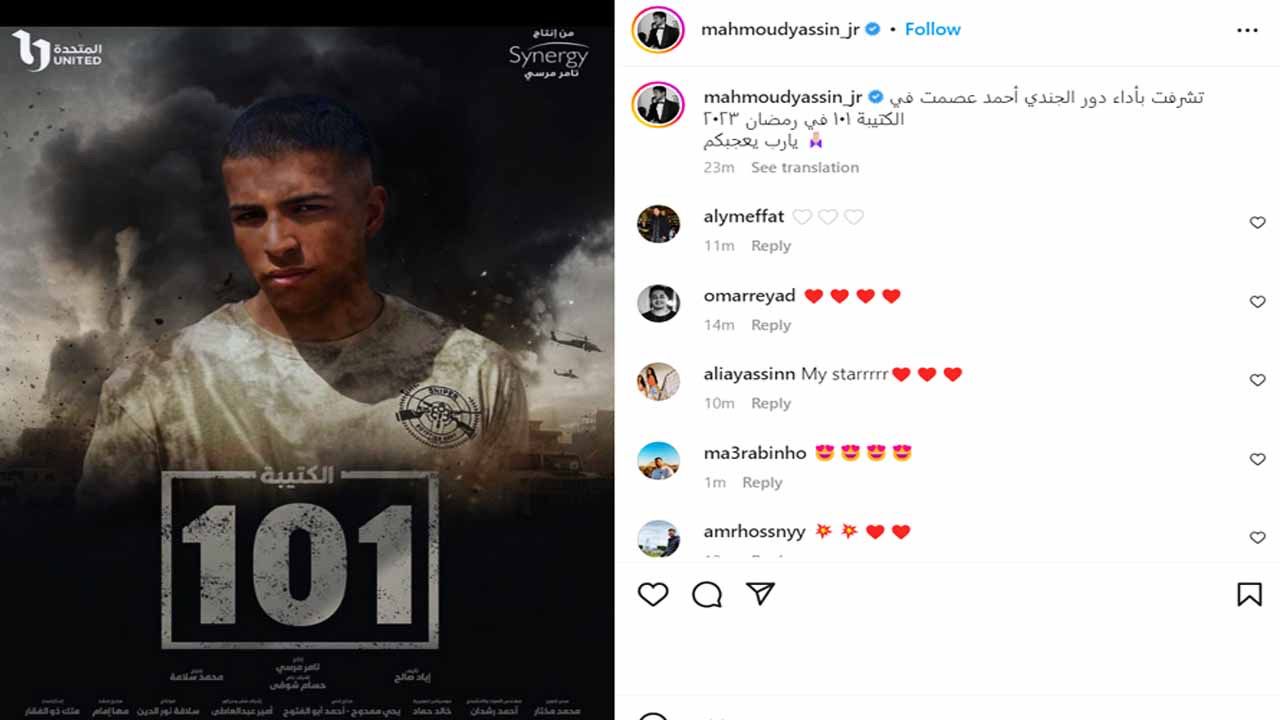 ونشر محمود ياسين جونيور بوستر مسلسل الكتيبة 101، عبر حسابه الرسمي على موقع التواصل الاجتماعي انستجرام، حيث قال: تشرفت بأداء دور الجندي أحمد عصمت في الكتيبة 101 في رمضان 2023.