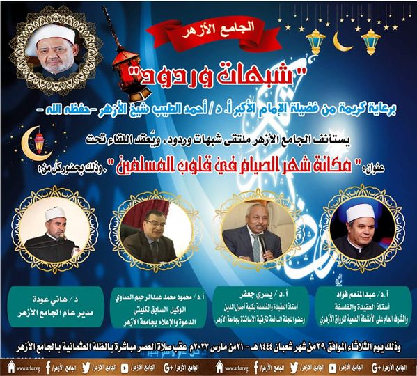 يعقد ملتقى شبهات وردود بالجامع الأزهر الشريف، عصر اليوم الثلاثاء، ندوة تحت عنوان: مكانة شهر الصيام في قلوب المسلمين، وذلك تحت رعاية الإمام الأكبر الدكتور أحمد الطيب شيخ الأزهر الشريف، وبتوجيهات من الدكتور محمد الضويني وكيل الأزهر، وإشراف الدكتور عبد المنعم فؤاد، المشرف على الرواق الأزهري، والدكتور هاني عودة، مدير عام الجامع الأزهر.