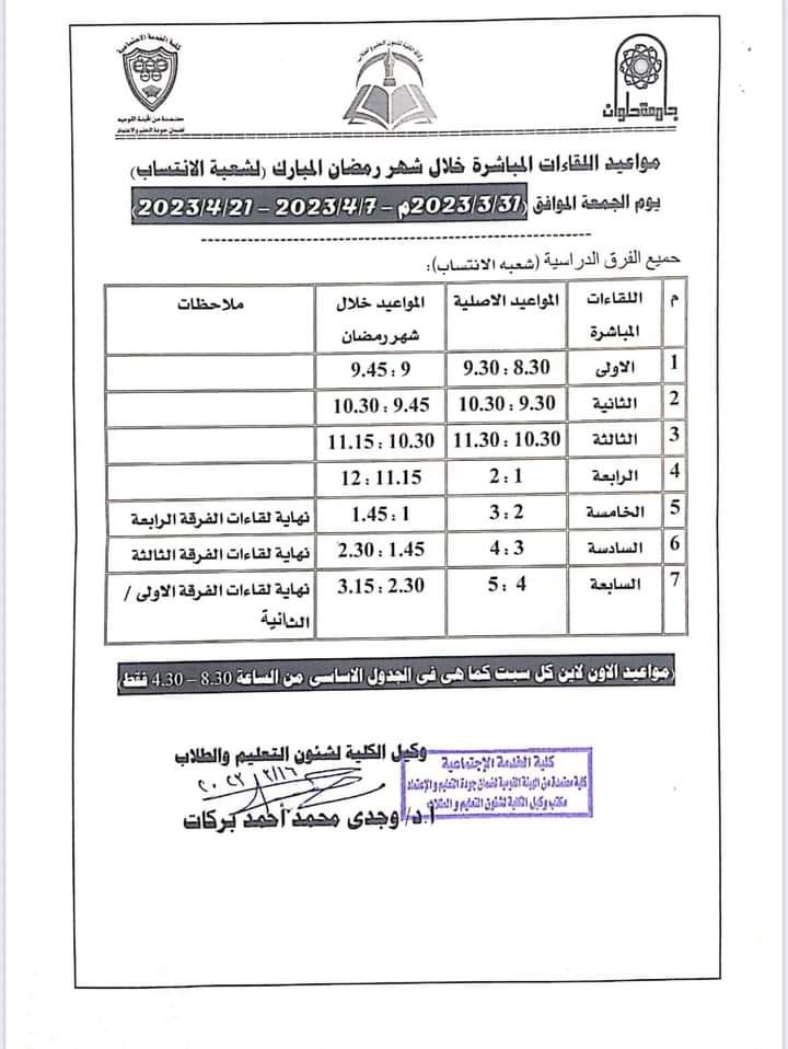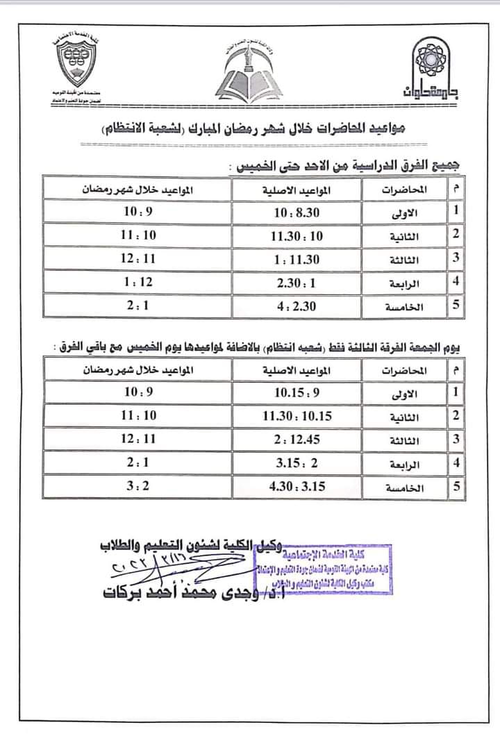 مواعيد المحاضرات الدراسية خلال شهر رمضان المبارك