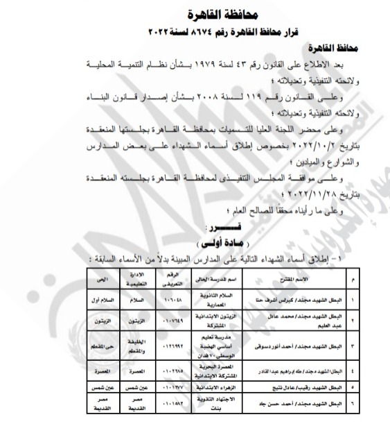 وصدر قرار اللواء خالد عبدالعال، محافظ القاهرة، بعد الاطلاع على القانون رقم 43 لسنة 1979 بشأن نظام التنمية المحلية وعلى القانون رقم 119 لسنة 2008 بشأن إصدار قانون البناء ولائحته التنفيذية وتعديلاته، ولائحته التنفيذية وتعديلاته، وعلى محضر اللجنة العليا للتسميات بمحافظة القاهرة بجلستها المنعقدة بتاريخ 2022/10/2 بخصوص إطلاق أسماء الشهداء على بعض المدارس والشوارع والميادين، وأيضا على موافقة المجلس التنفيذي لمحافظة القاهرة بجلسته المنعقدة بتاريخ 2022/11/28، وعلى ما رأه محققا للصالح العام.