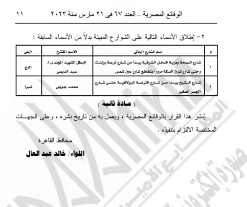 - شارع الشيخ يبدأ من شارع الترعة البولاقية حتى شارع الجسر الصغير، الواقع في حي شبرا، باستبداله باسم محمد جويلي.