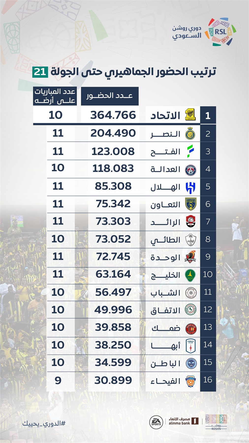 كشفت رابطة الدوري السعودي للمحترفين، أرقام الحضور الجماهيري في المسابقة حتى الجولة 21، والتي شهدت تفوق فريق اتحاد جدة المحترف ضمن صفوفه الثنائي الدولي المصري أحمد حجازي وطارق حامد على نادي النصر الذي يلعب ضمن صفوفه البرتغالي كريستيانو رونالدو.