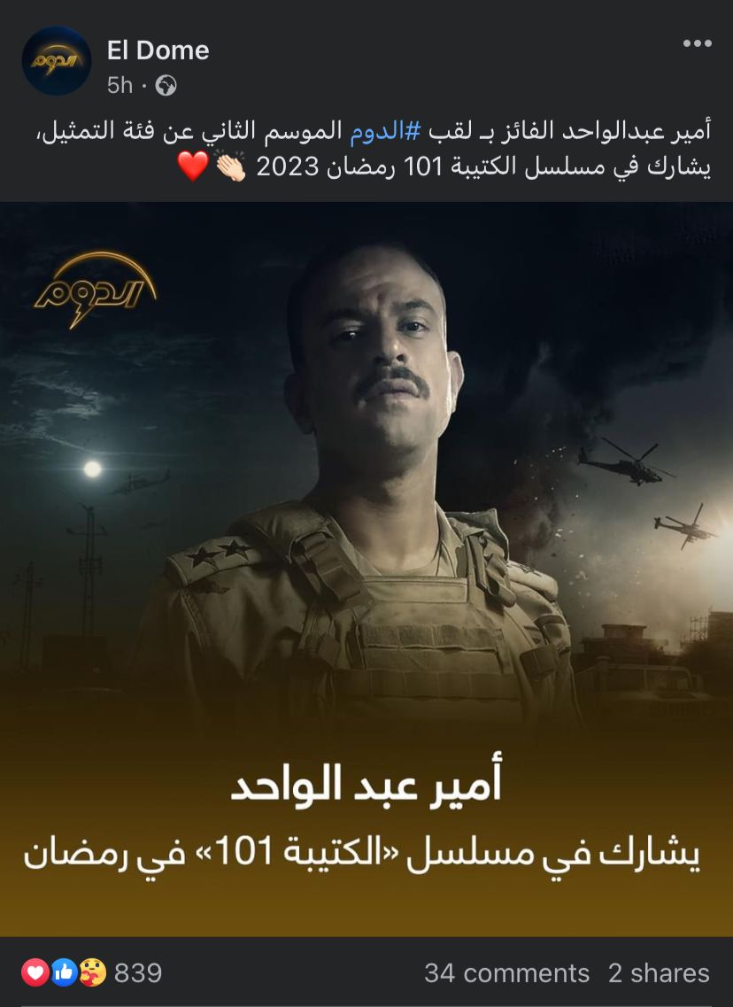 وأعلنت صفحة برنامج الدوم عن مشاركة أمير عبد الواحد في مسلسل الكتيبة 101 بنشر صورته من كواليس العمل معلقة: أمير عبدالواحد الفائز بـلقب الدوم الموسم الثاني عن فئة التمثيل، يشارك في مسلسل الكتيبة 101 رمضان 2023.