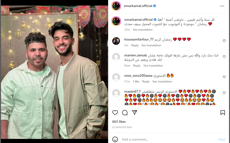 ونشر عمر كمال عبر حسابه الشخصي على موقع تبادل الصور والفيديوهات انستجرام، صورة له مع المطرب سيف مجدي، معلقًا: كل سنة وأنتم طيبين، دلوقتى أغنية أهلا رمضان موجودة على اليوتيوب مع الصوت الجميل سيف مجدي.