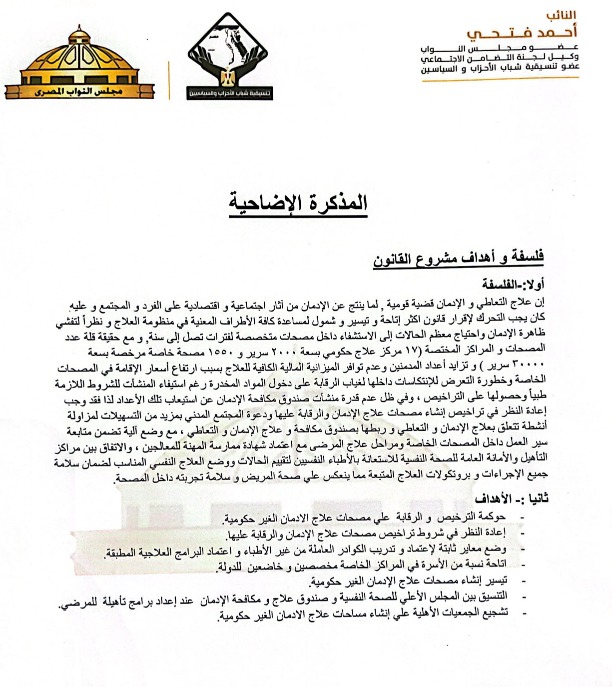 ويتناول مشروع القانون، ضمن مستهدفاته إعادة النظر في شروط تراخيص مصحات علاج الإدمان والرقابة عليها، كذلك وضع معايير ثابتة لاعتماد وتدريب الكوادر العاملة من غير الأطباء واعتماد البرامج العلاجية المطبقة.