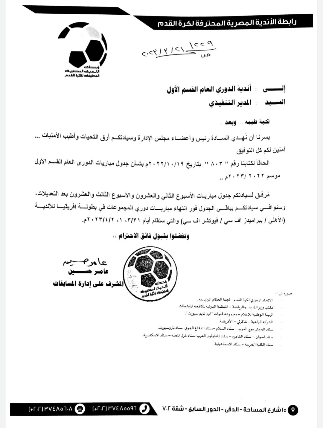 ووفقًا لنص الخطاب المرسل للأندية سيتم الإعلان عن باقي جدول الدوري بداية من الجولة الـ 24 وحتى نهاية الموسم، عقب انتهاء مشاركة الفرق المصرية في دور المجموعات ببطولتي دوري أبطال إفريقيا والكونفدرالية.