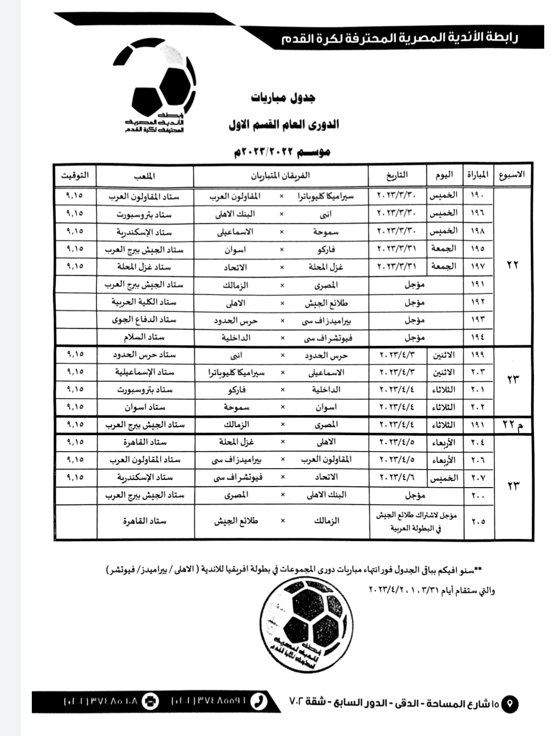 وأخطرت إدارة المسابقات برابطة الأندية فرق الدوري بأنه سيتم موافاتهم بباقي جدول مباريات الدوري فور انتهاء فرق الأهلي والزمالك وبيراميدز وفيوتشر من خوض منافسات الجولة الختامية لدور المجموعات ببطولتي دوري أبطال إفريقيا والكونفدرالية، التي تقام على مدار أيام 31 مارس الجاري و1 و2 إبريل المقبل.