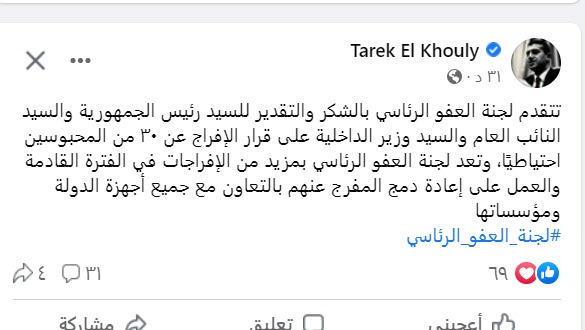 وكتب النائب طارق الخولي عضو لجنة العفو الرئاسي عبر فيس بوك: تتقدم لجنة العفو الرئاسي بالشكر والتقدير للسيد رئيس الجمهورية والسيد النائب العام والسيد وزير الداخلية على قرار الإفراج عن 30 من المحبوسين احتياطيًا، وتعد لجنة العفو الرئاسي بمزيد من الإفراجات في الفترة القادمة والعمل على إعادة دمج المفرج عنهم بالتعاون مع جميع أجهزة الدولة ومؤسساتها.