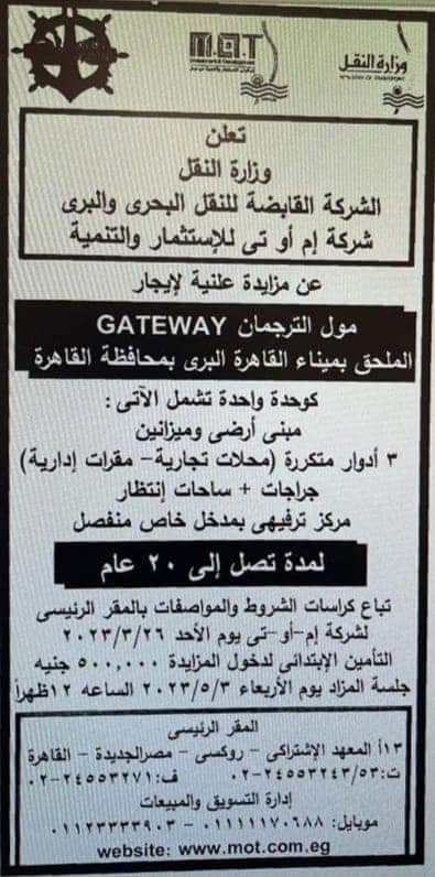 أعلنت وزارة النقل ممثلة في الشركة القابضة للنقل البحري والبري وشركة إم أو تي للاستثمار والتنمية، طرح مزايدة علنية لإيجار مول الترجمان الملحق بميناء القاهرة البري بمحافظة القاهرة.