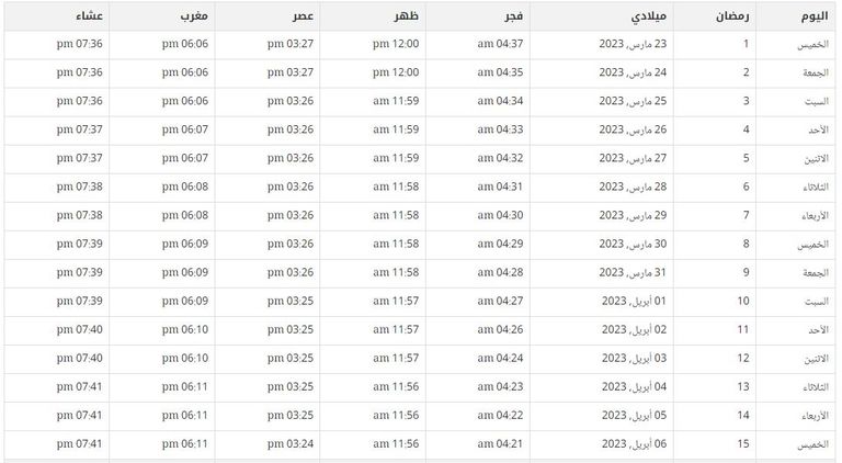 تبدأ أول أيام رمضان 2023 غدا الخميس الموافق 23 مارس، ولكن تفاصيل أول أيام رمضان تبدأ من اليوم حيث موعد صلاة التراويح، وموعد تناول السحور وموعد أذان الفجر الذي يبدأ به الصيام، ولذلك نوضح لكم تفاصيل أول أيام رمضان بتوقيت القاهرة وفقا لـ إمساكية رمضان 2023.