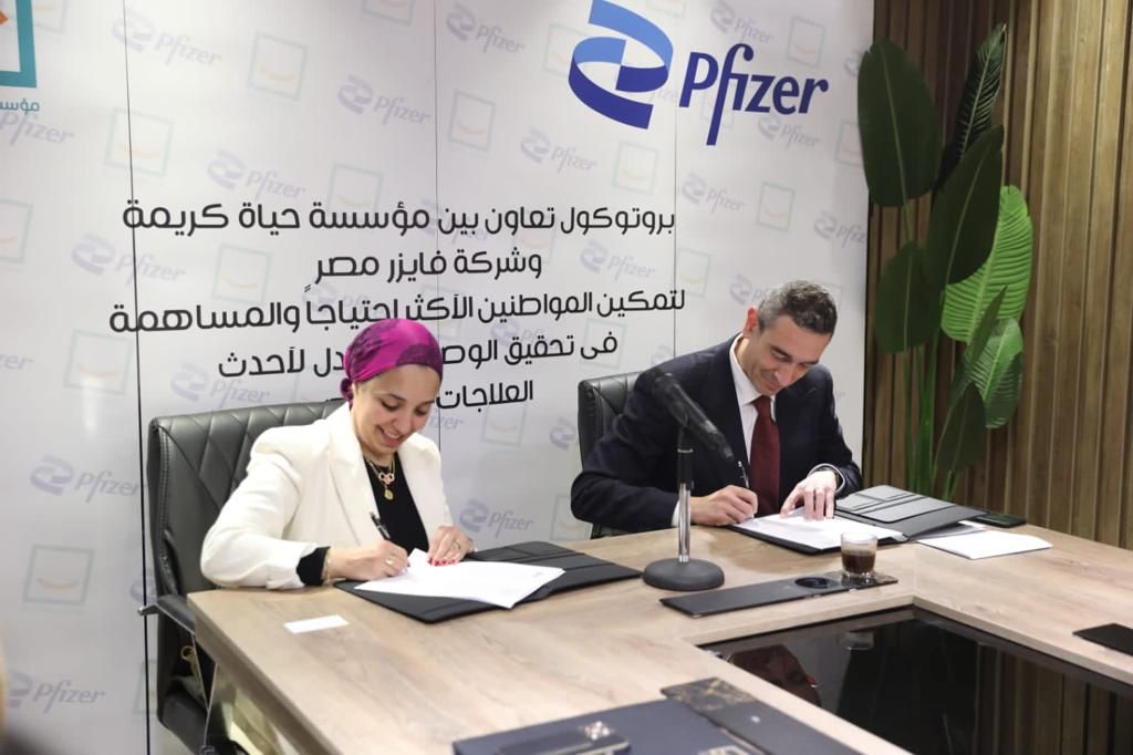 وقع البروتوكول الدكتور أحمد الشاذلي المديرالإقليمي لشركة فايزر لمصر والسودان ودول المشرق العربي والعراق، وعهود وافي نائب رئيس مجلس أمناء مؤسسة حياة كريمة، بمقر المؤسسة.