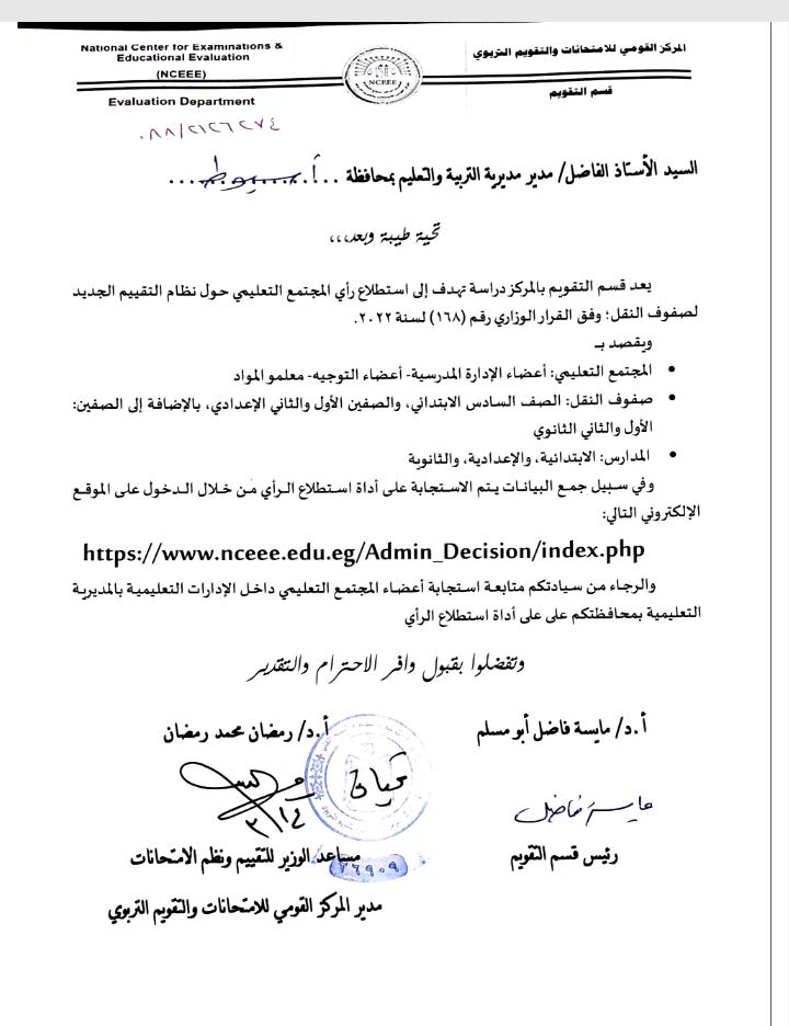 وجه المركز القومي للامتحانات والتقويم التربوي، خطابًا مهمًا بشأن استطلاع رأي المجتمع التعليمي حول نظام التقييم الجديد لصفوف النقل.