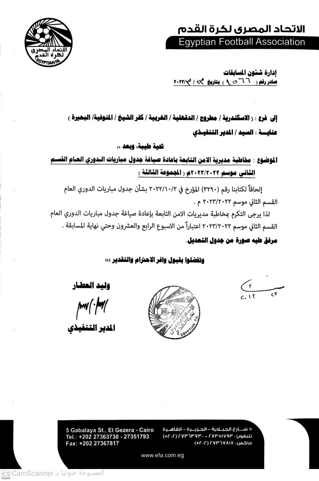إلحاقًا لكتابنا رقم 3290 المؤرخ في 2-10-2022 بشأن جدول مباريات الدوري العام القسم الثاني موسم 2002-20223م.