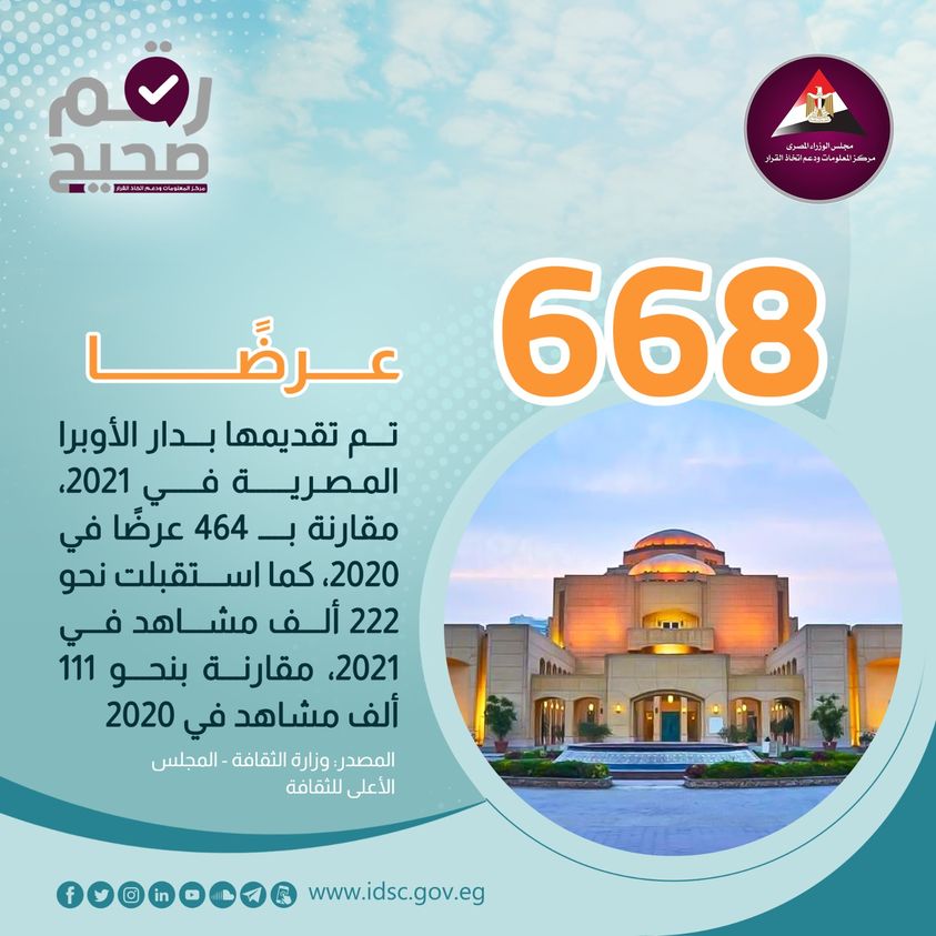 نشر مركز المعلومات ودعم اتخاذ القرار بمجلس الوزراء، إنفوجرافا يؤكد أن 668 عرضا تم تقديمها بدار الأوبرا المصرية في 2021، مقارنة بـ464 عرضا في 2020، كما استقبلت نحو 222 ألف مشاهد في 2021، مقارنة بنحو 111 ألف مشاهدة في 2020.