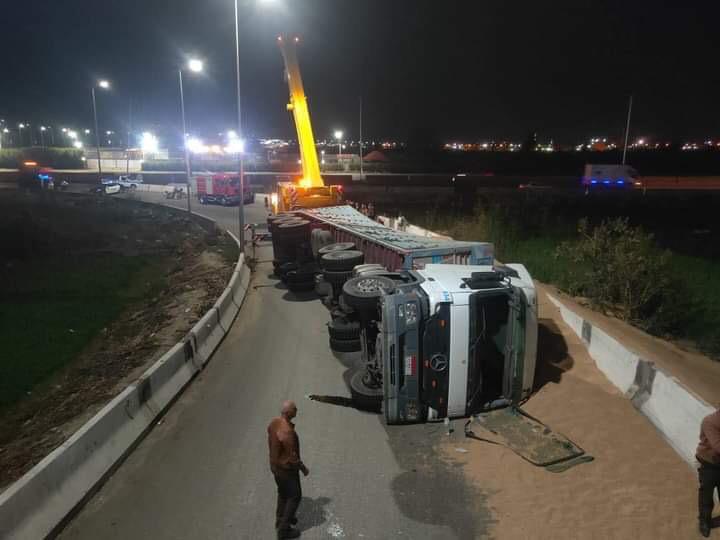 انقلبت سيارة نقل محملة بـ60 طن قمح، بمحور شرنقاش الواصل بين طريق دمياط الشرقي ورافد جمصة الساحلي، في نطاق مركز طلخا بمحافظة الدقهلية، مساء اليوم، أول أيام شهر رمضان المبارك، وذلك نتيجة اختلال عجلة القيادة في يد السائق، ما تسبب في توقف الحركة المرورية.