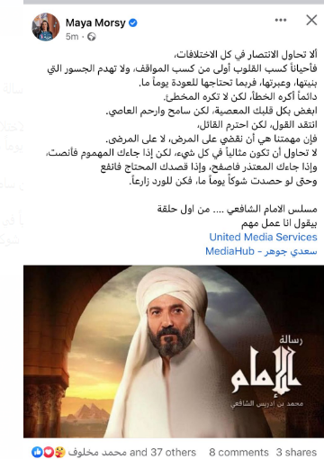 وقالت مايا مرسي في تدوينة على موقع فيس بوك: ألا تحاول الانتصار في كل الاختلافات، فأحيانًا كسب القلوب أولى من كسب المواقف، ولا تهدم الجسور التي بنيتها، وعبرتها، فربما تحتاجها للعودة يومًا ما.