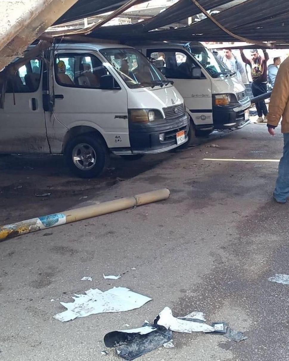 وبالفحص تبين انهيار 5 باكيات من الموقف على سيارات الميكروباص المتوقفة بداخل الموقف، نتيجة للرياح الشديد والعوامل الجوية بالإضافة إلى أن الموقف قديم وتم إنشاؤه منذ عدة سنوات.