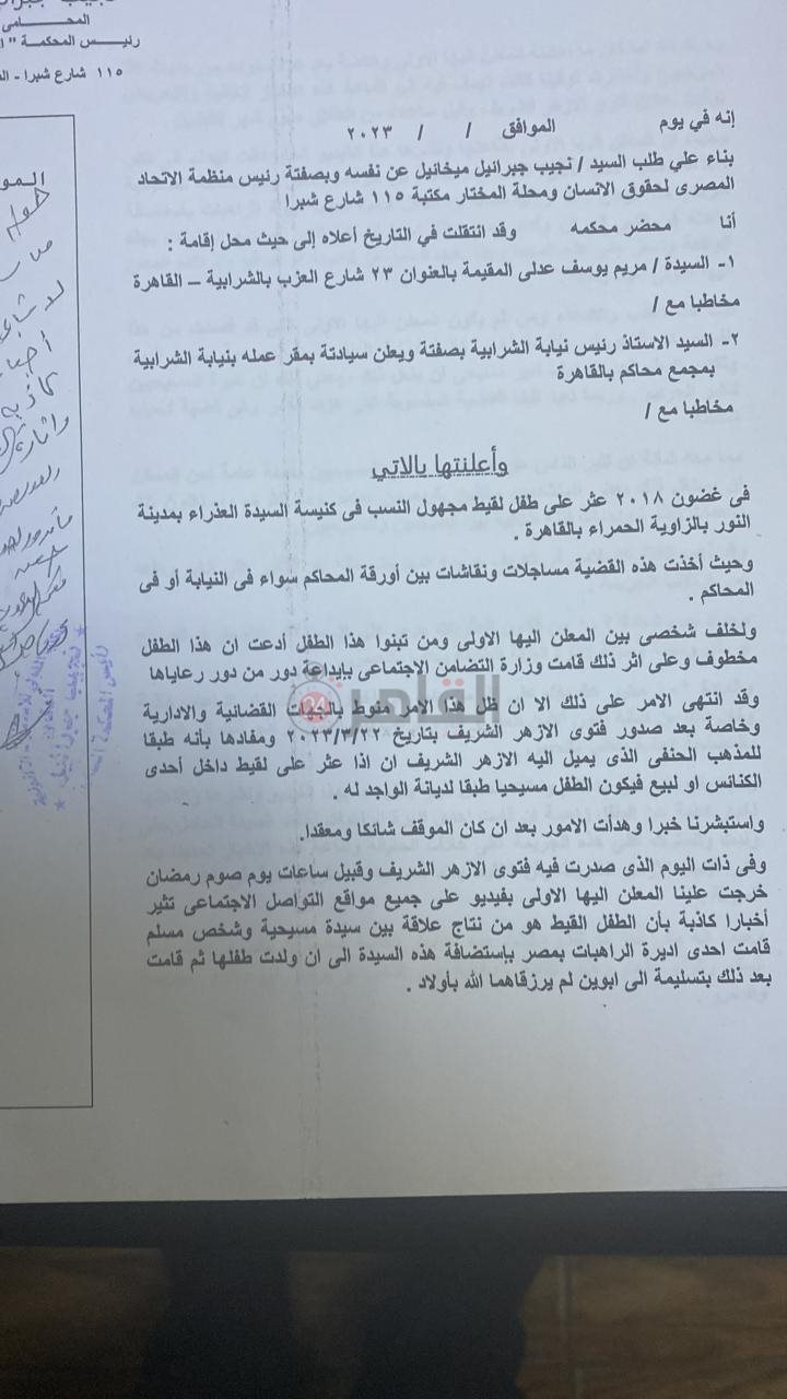 بعد زعمها بأنه من علاقة غير شرعية.. محامي الطفل شنودة يتقدم ببلاغ ضد إحدى أقارب أسرة الطفل بالتبني