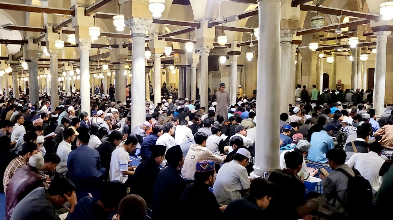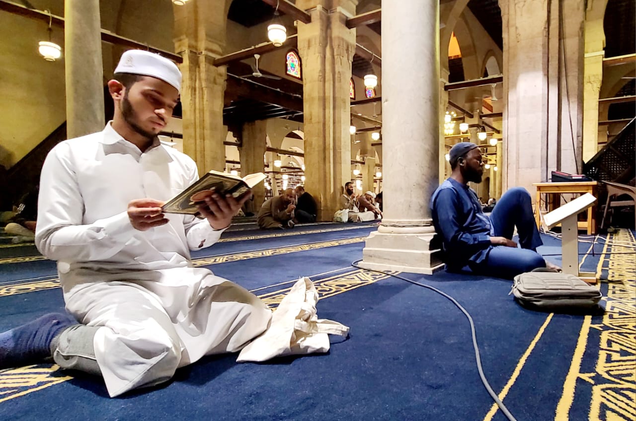 في رحاب أروقة الجامع الأزهر وبين جدرانه العتيقة وتحت مآذنه السامقة، التف الطلاب الوافدون في حلقات متجاورة ومنتظمة يتلون كتاب الله ويتدارسونه، يمسك كل واحد بمصحفه ويرتل من القرآن ما هو شفاء للناس ورحمة للمؤمنين، ويقضون وقتهم في ذكر الله وقراءة القرآن قبل ساعات من الإفطار.