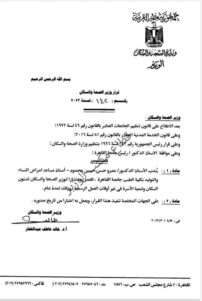 ونص القرار رقم 142 لسنة 2023 على أن يتولى الدكتور عمرو حسن، منصب مستشارا لوزير الصحة لشئون السكان، لمدة عام في غير أوقات العمل الرسمية.
