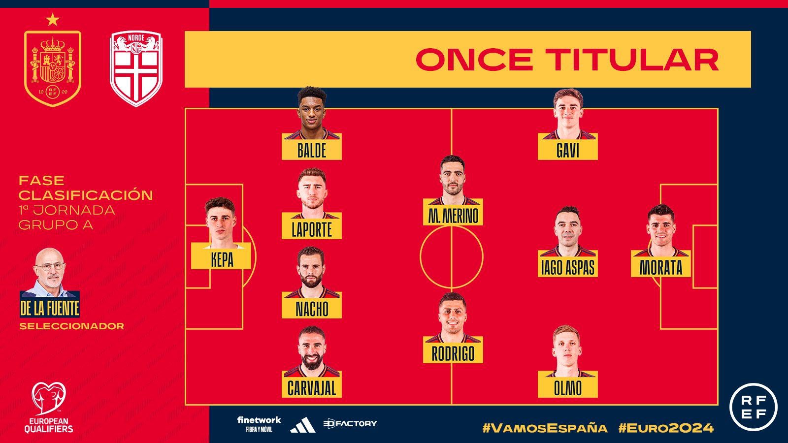 قرر المدرب الإسباني لويس دي لا فيوينت، مدرب إسبانيا، أن يدخل مباراة فريقه لمواجهة النرويج بتصفيات أمم أوروبا، بالتشكيل التالي:
