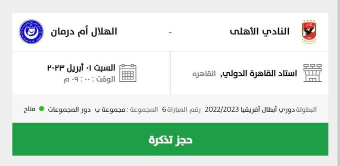 وطرحت تذاكر مباراة الأهلي والهلال السوادني عبر موقع تذكرتي، والمقرر لها حضور 50 ألف مشجع لجماهير المارد الأحمر، و100 تذكرة لجمهور فريق الهلال.