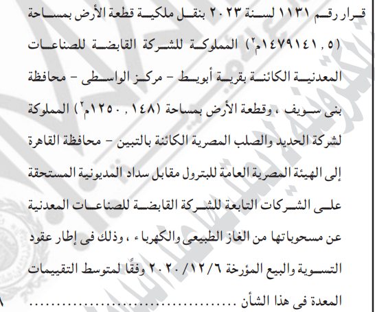 نشرت الجريدة الرسيمة في عددها الصادر منذ قليل، قرارًا جديدًا للدكتور مصطفى مدبولي، رئيس مجلس الوزراء، وذلك بشأن نقل ملكية قطعة أرض مملوكة للشركة القابضة للصناعات المعدنية الكائنة بقرية أبويط – مركز الواسطى – محافظة – بني سويف، وقطعة أرض مملوكة لشركة الحديد والصلب المصرية الكائنة بالتبين – محافظة القاهرة إلى الهيئة المصرية العامة للبترول مقابل سداد المديونية المستحقة على الشركات التابعة للشركة القابضة للصناعات المعدنية عن مسحوباتها من الغاز الطبيعي والكهرباء، وذلك في إطار عقود،التسوية والبيع المؤرخة 6- 12- 2020 وفقًا لمتوسط التقييمات المعدة في هذا الشأن.