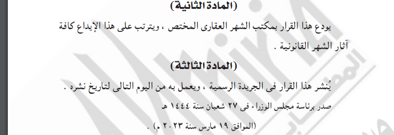 ونصت المادة الثانية من القرار الصادر في الجريدة الرسمية، بأن يودع هذا القرار بمكتب الشهر العقاري المختص، ويترتب على هذا الإيداع كافة آثار الشهر القانونية، على أن ينشر هذا القرار في الجريدة الرسمية، ويعمل به من اليوم التالي لتاريخ نشره.