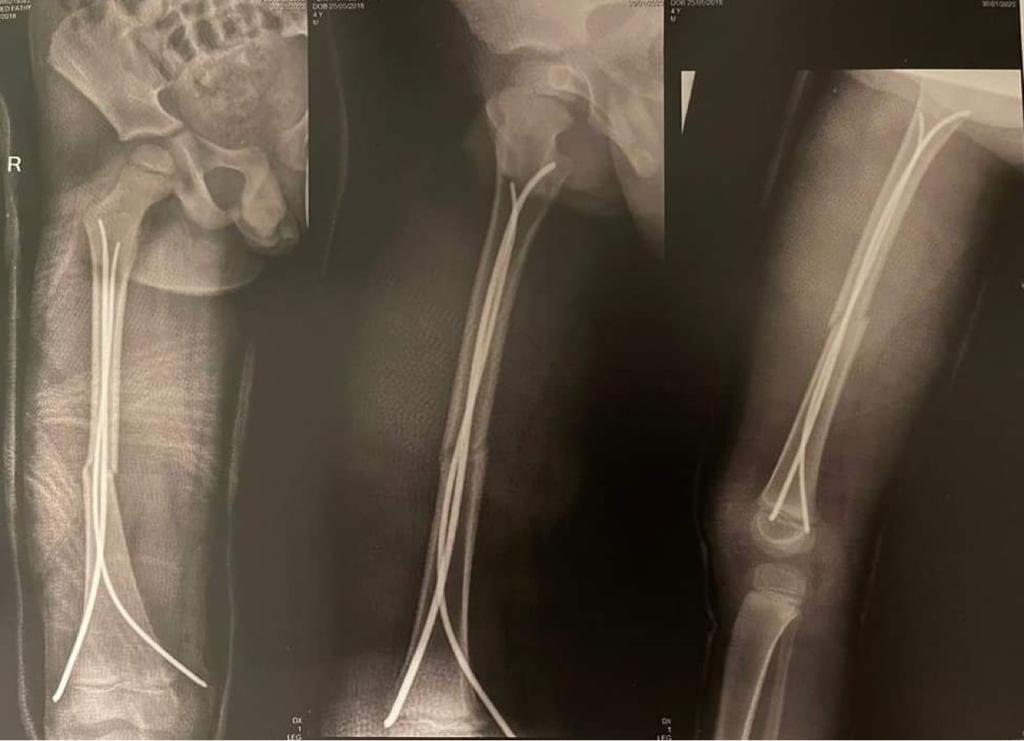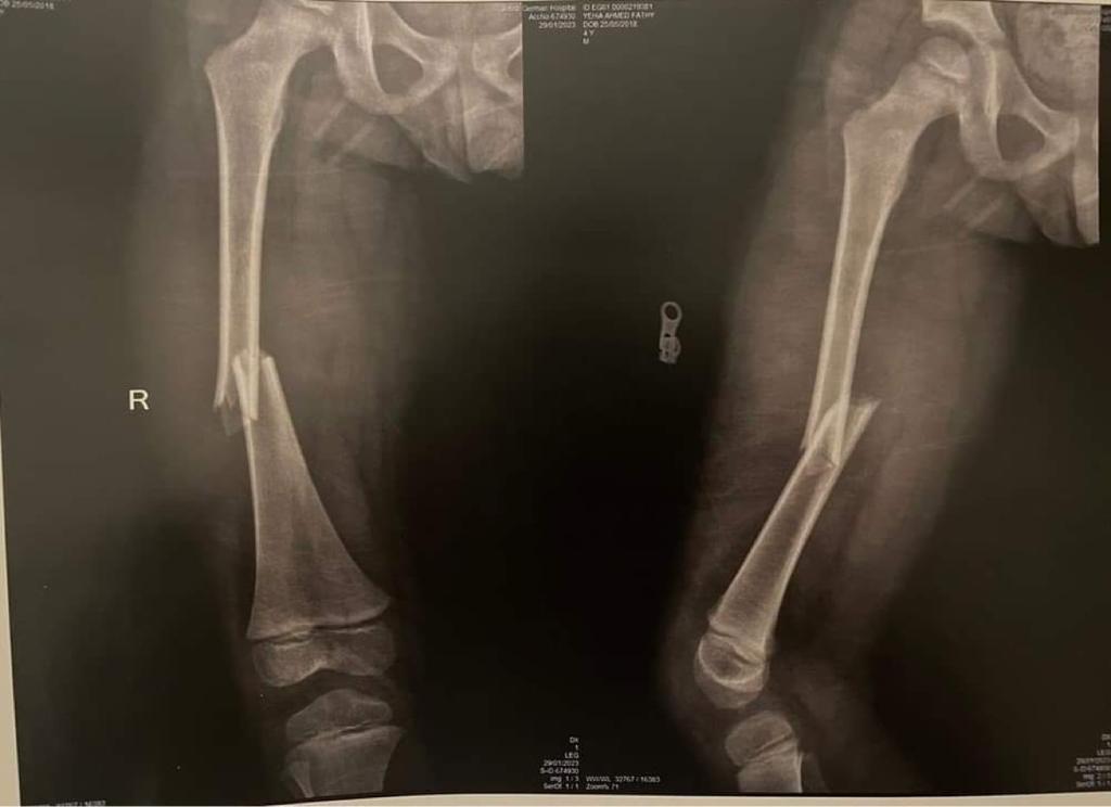 وأخبرت المستشفى والدة الطفل أنه مصاب بكسر في عظمة الفخذ، ويحتاج إلى عملية جراحية، ومن بعدها علاج طبيعي ويحتاج إلى عملية أخرى.