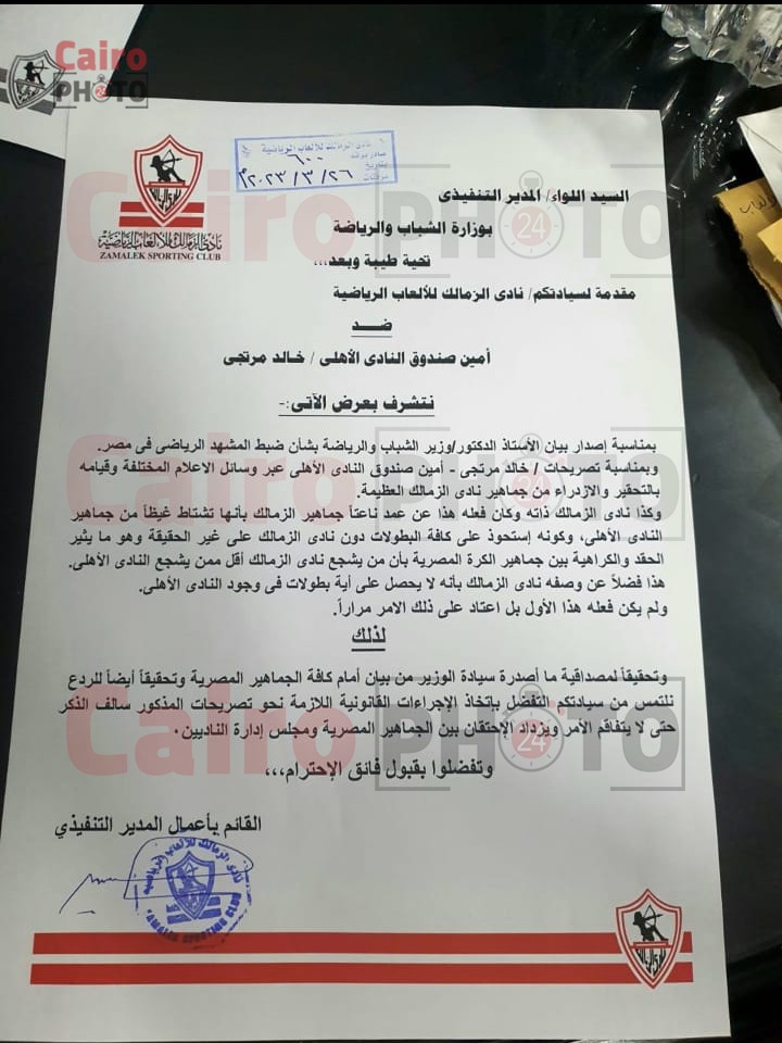 طلب مجلس إدارة نادي الزمالك برئاسة المستشار مرتضى منصور، بشكل رسمي من وزارة الشباب والرياضة التحقيق مع خالد مرتجي أمين صندوق مجلس إدارة نادي الأهلي، واتخاذ الإجراءات القانونية ضده تنفيذا للبيان الذي أصدره وزير الرياضة أمس حول التجاوزات التي تصدر وتزيد الاحتقان والفتنة بين الجماهير.