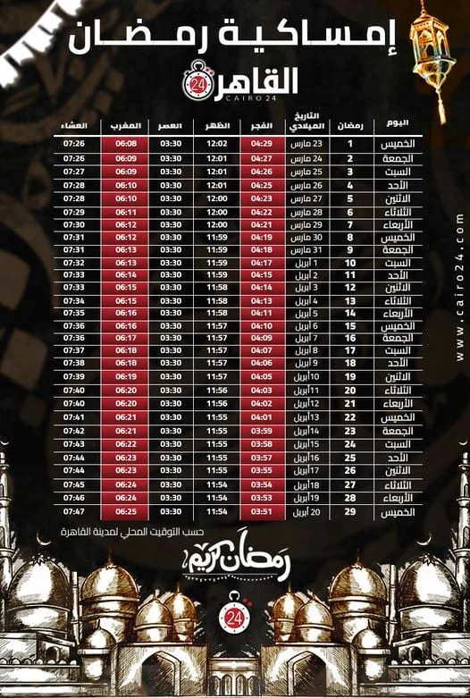 وتزامنًا مع حلول شهر رمضان، أصدرت الهيئة العامة للمساحة إمساكية رمضان، وذلك لكي يكون بإمكان الصائمين معرفة مواقيت الصلاة في رمضان 2022 دون معاناة مراعاة فروق التوقيت.
