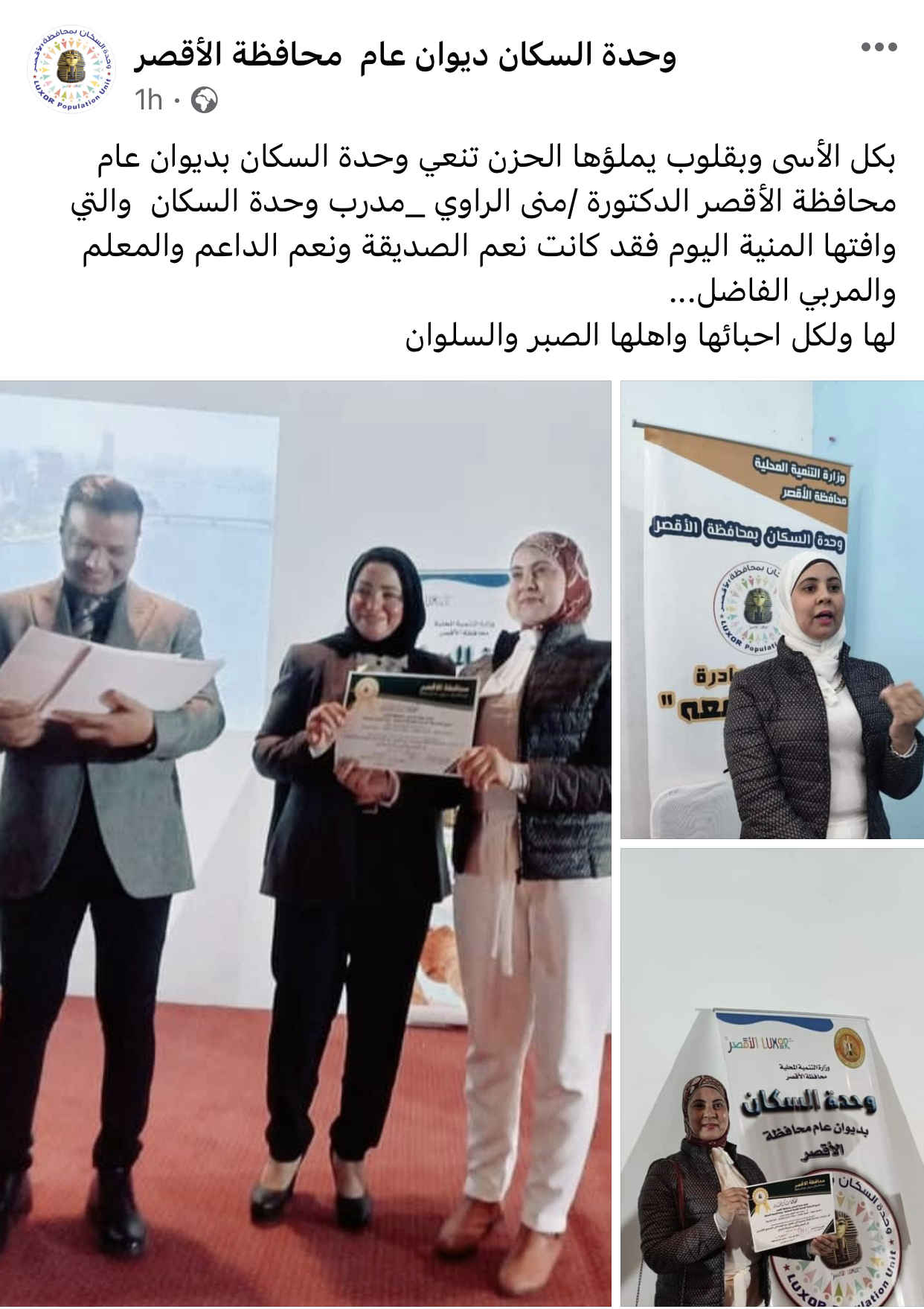 ونعت وحدة السكان بديوان عام محافظة الأقصر الفقيدة على صفحتها قائلة: بكل الأسى وبقلوب يملؤها الحزن تنعى وحدة السكان بديوان عام محافظة الأقصر الدكتورة منى الراوي _مدرب وحدة السكان والتي وافتها المنية اليوم فقد كانت نعم الصديقة ونعم الداعم والمعلم والمربي الفاضل، لها ولكل أحبائها واهلها الصبر والسلوان.