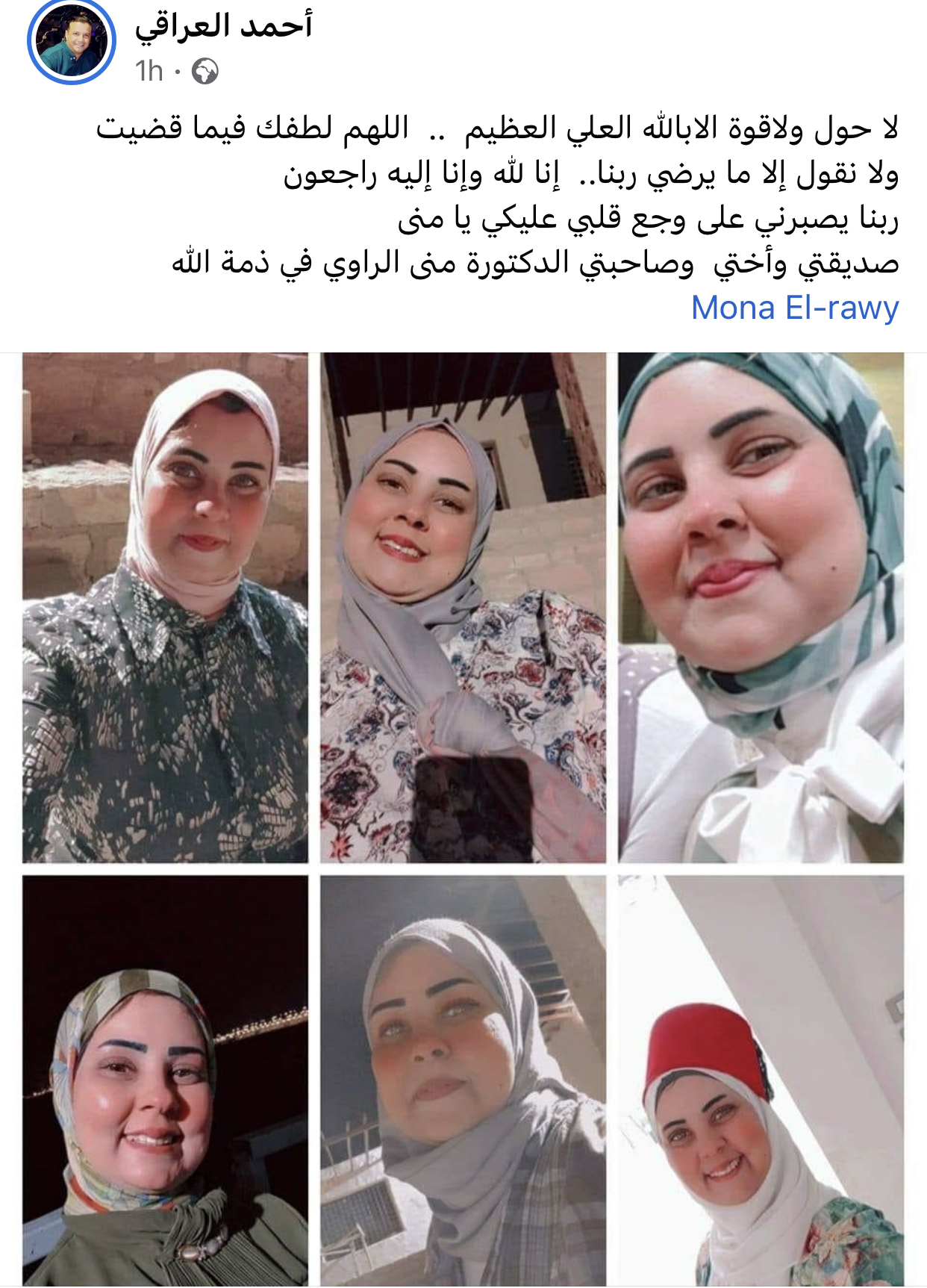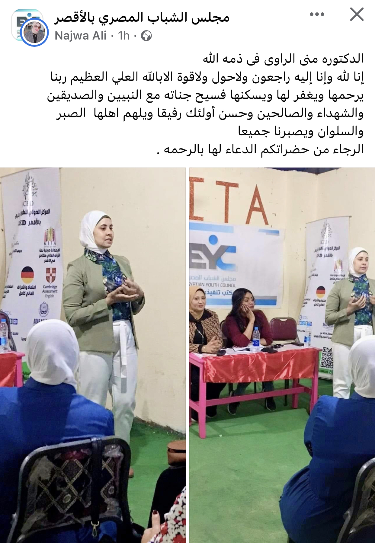 ونعى مجلس الشباب بالأقصر الدكتورة الشابة على صفحته قائلا: الدكتوره منى الراوى فى ذمه الله، إنا لله وإنا إليه راجعون ولاحول ولاقوة الابالله العلي العظيم ربنا يرحمها ويغفر لها ويسكنها فسيح جناته مع النبيين والصديقين والشهداء والصالحين وحسن أولئك رفيقا ويلهم اهلها الصبر والسلوان ويصبرنا جميعا الرجاء من حضراتكم الدعاء لها بالرحمه.
