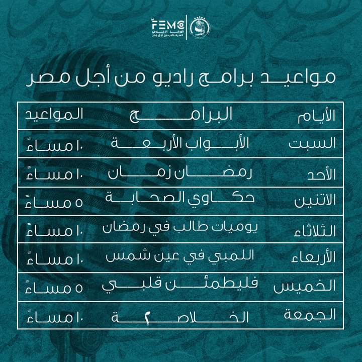 وأضافت أسرة من أجل مصر بـ جامعة عين شمس، أن يوم الأربعاء البرنامج سيكون تحت عنوان اللمبي في عين شمس في تمام الساعة 10 مساءً، ويوم الخميس البرنامج سيكون عبارة عن فليطمئن قلبي في تمام الساعة 5 مساءًَ، وأخيرًا يوم الجمعة البرنامج تحت عنوان الخلاصة في تمام الساعة الـ 10 مساءً.