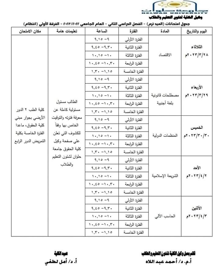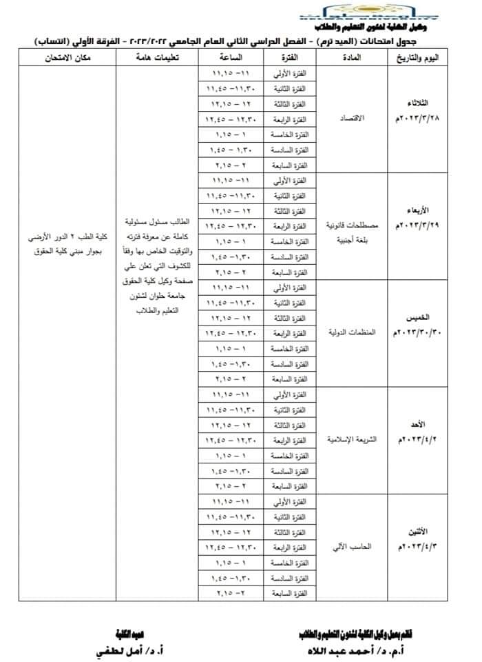 وكتبت كلية الحقوق بـ جامعة حلوان عبر صفحتها الرسمية على موقع التواصل الاجتماعي فيسبوك، منشورًا، جاء مضمونه: إن امتحانات الميدتيرم سوف تجرى في كلية الطب الدور الأرضي، مؤكدة أن إن الطالب مسئول مسئولية كاملة عن معرفة فترته والتوقيت الخاص بها وفقًا للكشوف.