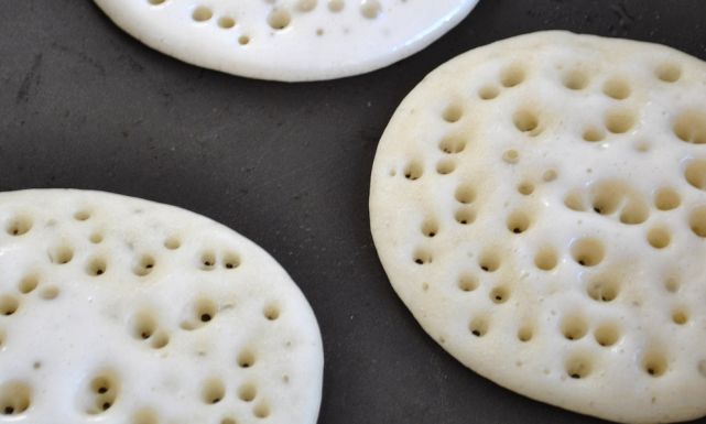 - يتم تسخين الصاج ودهنها بالزيت، على أن يتم وضع 2 ملعقة من القطايف، بحيث تصبح عبارة عن الدائرة الصغيرة، وتترك إلى أن تصبح مستوية ولونها ذهبي، وبها فقاعات.