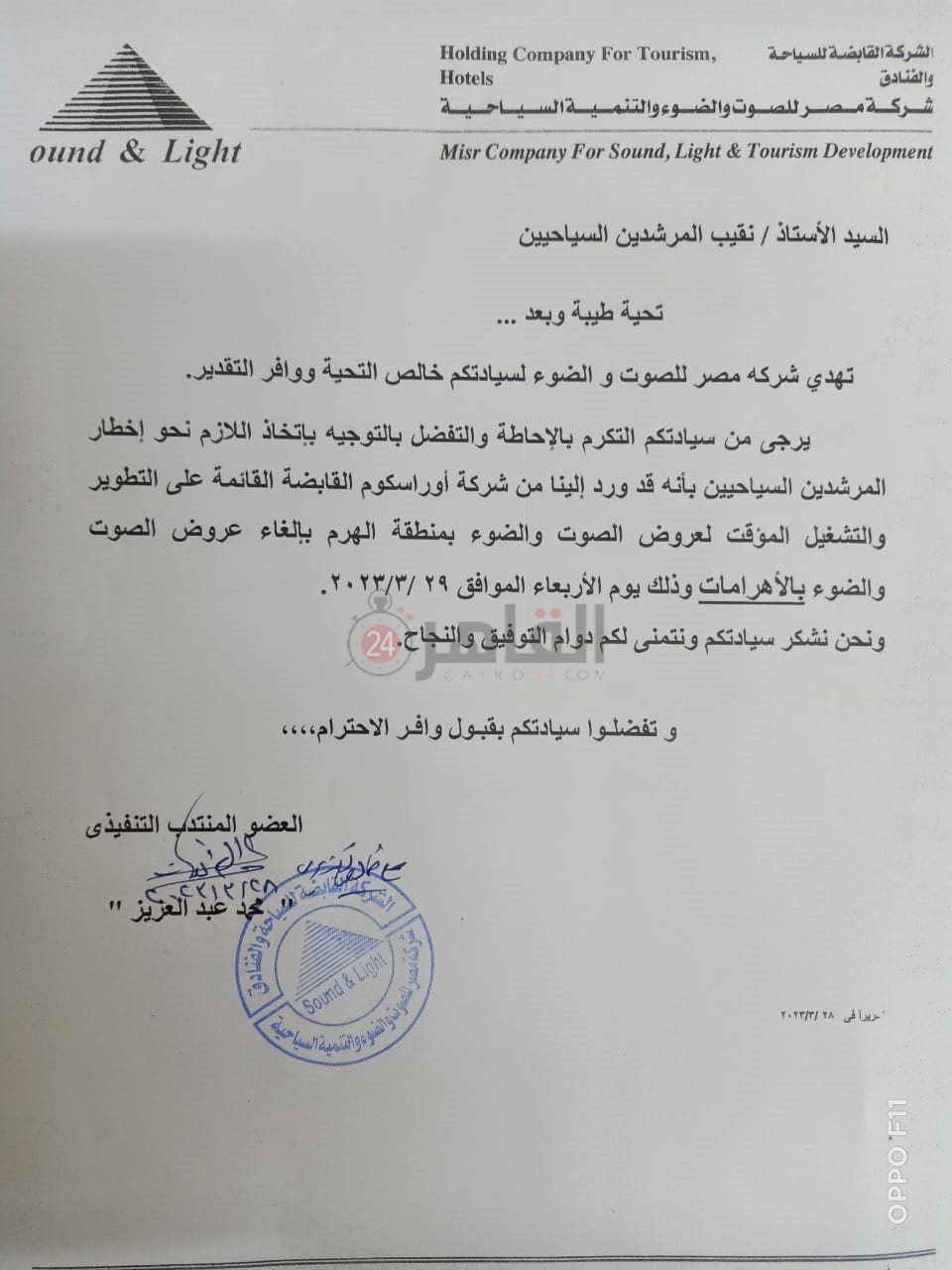 وجاء ذلك الإعلان خلال خطاب موجة من شركة الصوت والضوء إلى النقابة العامة للمرشدين السياحيين، وحصل القاهرة 24 على نسخة منه.
