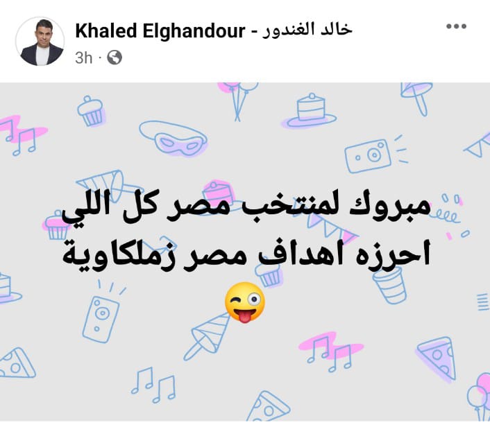 خرج خالد الغندور نجم نادي الزمالك الأسبق، عقب فوز منتخب مصر على نظيره مالاوي، بمنشور على صفحته على موقع التواصل الاجتماعي فيس بوك، يبارك فيه لمنتخب مصر.