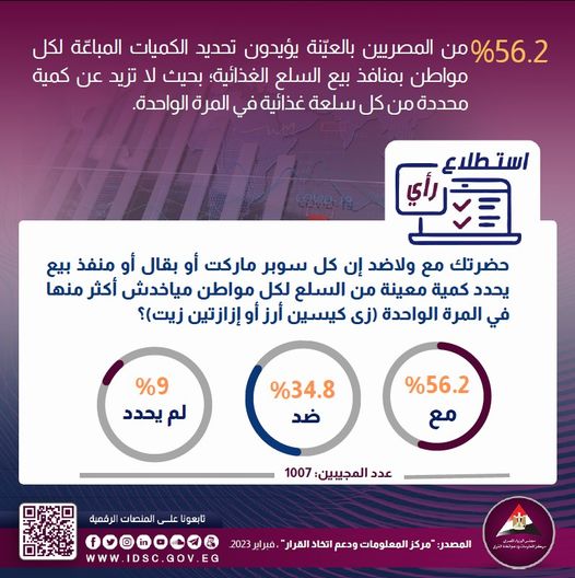 وفي هذا السياق، أجرى مركز المعلومات ودعم اتخاذ القرار استطلاع لرأي المواطنين، وذلك على حجم عينة بلغ 1007 أشخاص بالغين، بهدف التعرف على مدى موافقتهم على تحديد بعض السلاسل التجارية كمية من السلع لكل مواطن، وأعرب 56.2% من المصريين عن تأييدهم لتحديد الكميات المباعّة لكل مواطن بمنافذ بيع السلع الغذائية؛ بحيث لا تزيد عن كمية محددة من كل سلعة غذائية في المرة الواحدة، مقابل 34.8% من المصريين عارضوا ذلك.