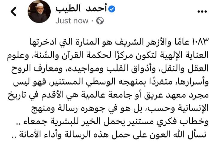 احتفى الدكتور أحمد الطيب، شيخ الأزهر، على صفحته الرسمية بمواقع التواصل الاجتماعي، بالذكرى السنوية للأزهر الشريف ومرور 1083 عامًا هجريا على تأسيسه.