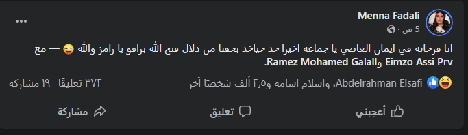 وتفاعلت الفنانة منة فضالي مع حلقة الفنانة إيمان العاصي في برنامج رامز نيفر إند، ونشرت عبر حسابها الشخصي بموقع التواصل الاجتماعي فيسوك: أنا فرحانه في إيمان العاصي يا جماعه أخيرًا حد هياخد حقنا من دلال فتح الله برافو يا رامز والله.