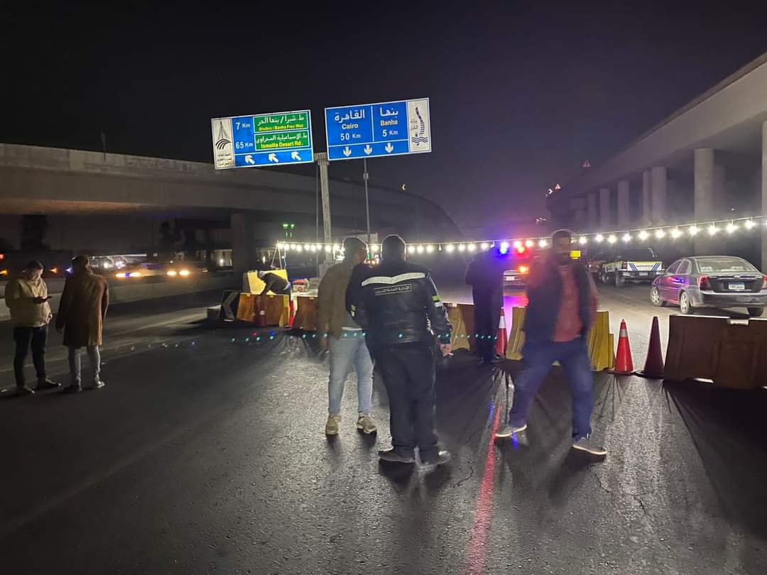 تحويلات مرورية بعد هبوط أرضي بكوبري في بنها بطريق إسكندرية الزراعي│ صور