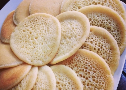 - والآن قوم بتسخين مقلاة غير قابلة للالتصاق وتدهن بالزيت ويوضع بواسطة الملعقة العجين على شكل دائرة، ويترك إلى أن يصبح لونها ذهبي، ثم ترفع من على النار وتغطى بواسطة قطعة قماش.