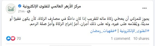 وأكد مركز الأزهر العالمي للفتوى الإلكترونية، عبر صفحته الرسمية على موقع التواصل الاجتماعي فيسبوك، أن إعطاء المزكي زكاة ماله للقريب إذا كان داخلًا في مصارف الزكاة، كأن يكون فقيرًا أو مدينًا ويقدمه على غيره، له على ذلك أجران، حيث أجر إخراج الزكاة وأجر صلة الرحم.