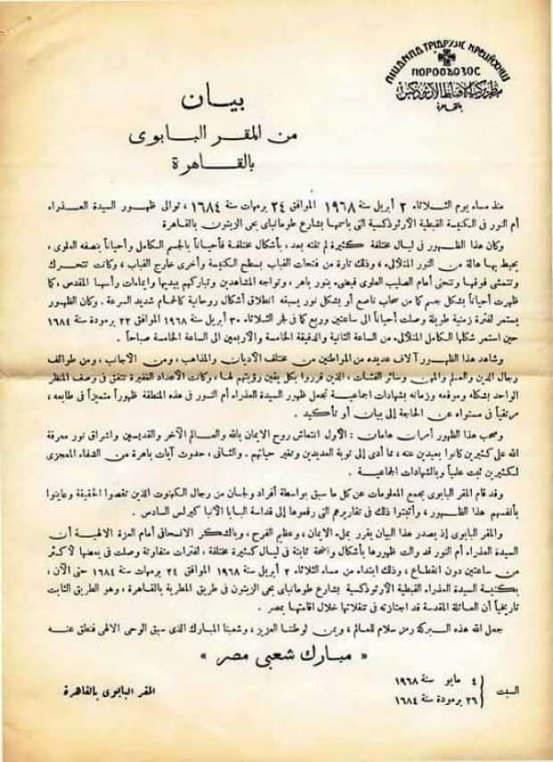وأكد المقر البابوي للكنيسة القبطية الأرثوذكسية في عهد الراحل البابا كيرلس السادس، في بيان له صدر في 4 مايو 1968م، ظهور العذراء، حيث جاء نص البيان: إنه منذ مساء يوم الثلاثاء 2 أبريل سنة 1968، توالى ظهور السيدة العذراء في الكنيسة القبطية الأرثوذكسية التي تحمل اسمها بشارع طومان باي بحي الزيتون بالقاهرة.